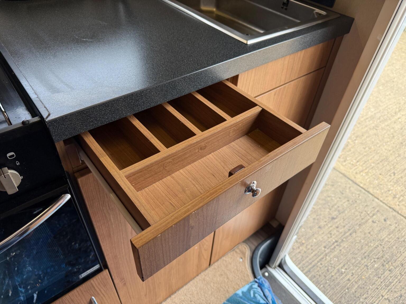 Spec includes: End Kitchen, Front Lounge - 2 x Singles or 1 x Double, Separate Shower & Toilet, TRUMA Blown Air Heating, Grill/Oven, 3 Ring Gas Hob, LED Lighting, Wind out awning, Fiamma bike rack, solar panel system, rear view camera system, Digital TV, roof mounted aerial, 2 x rotating front seats, removable table, external shower, external BBQ point, Microwave oven (240v), 3 way fridge/freezer, Air Conditioning (front cab), CD player.