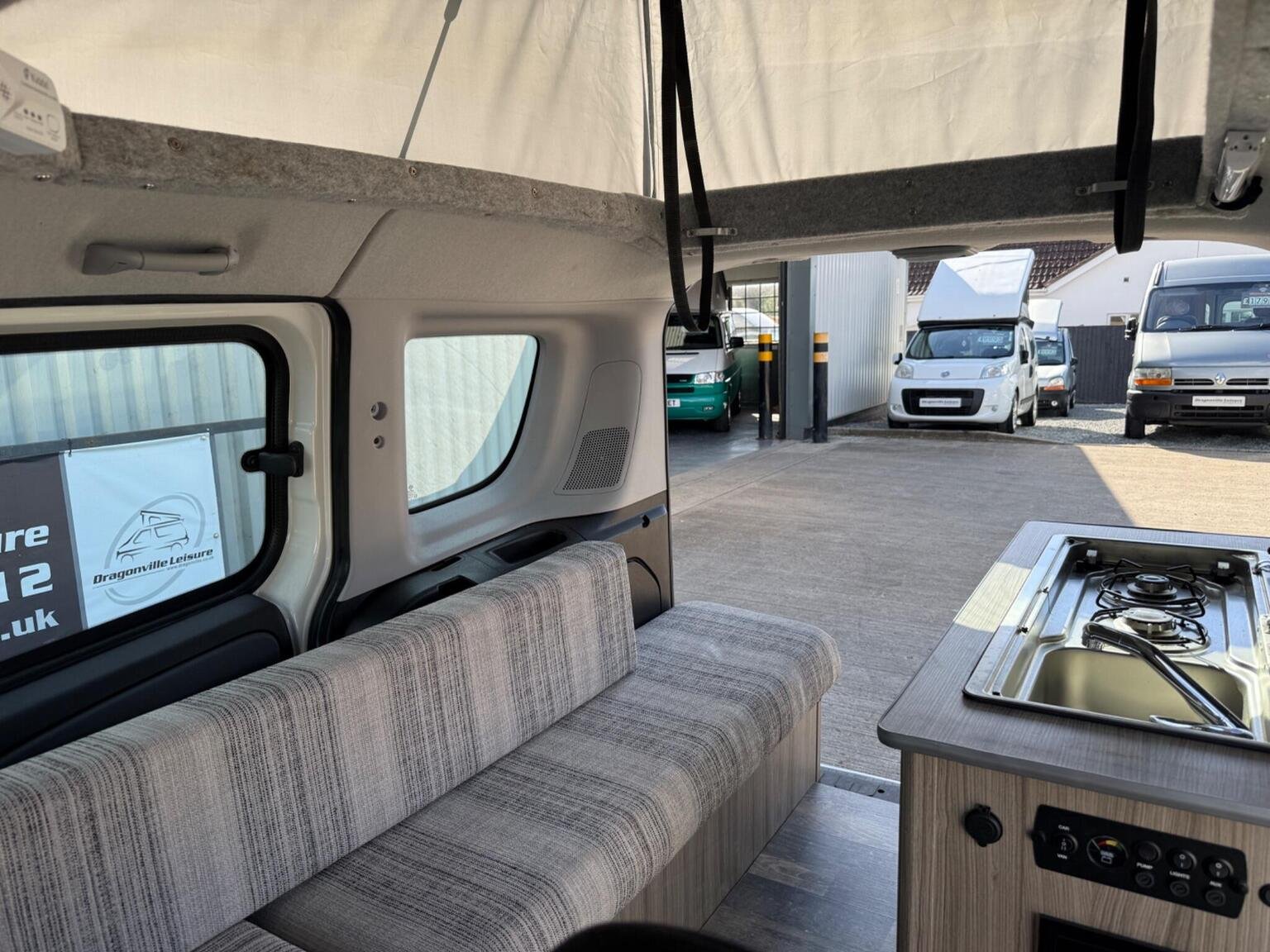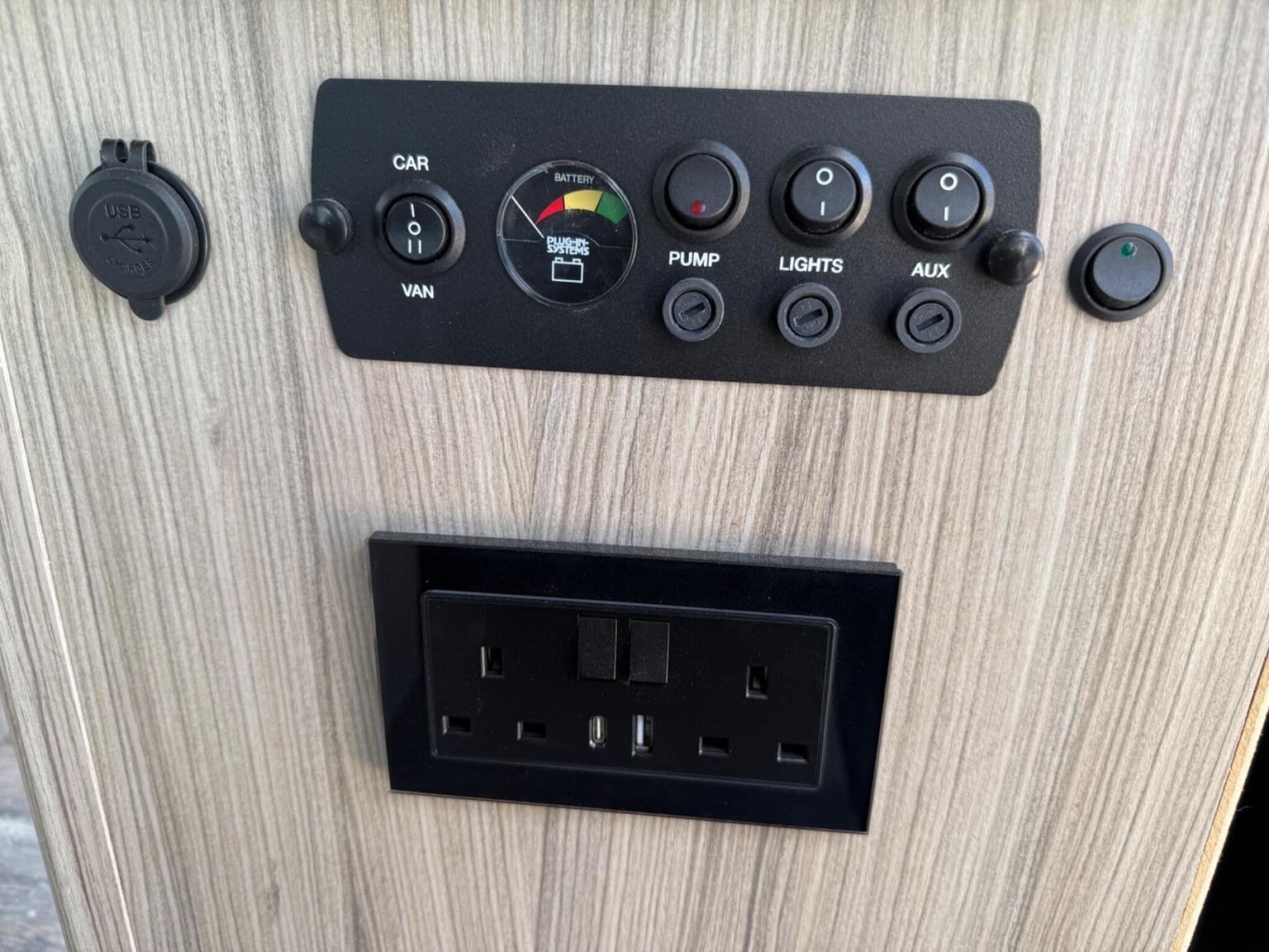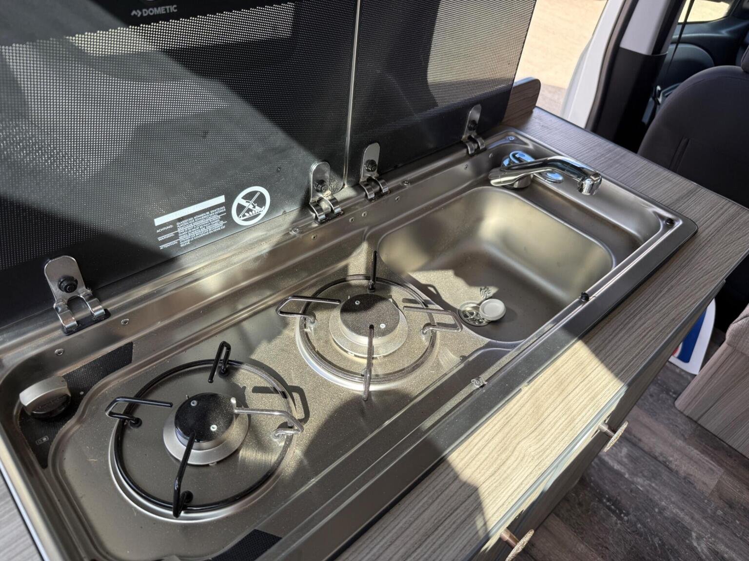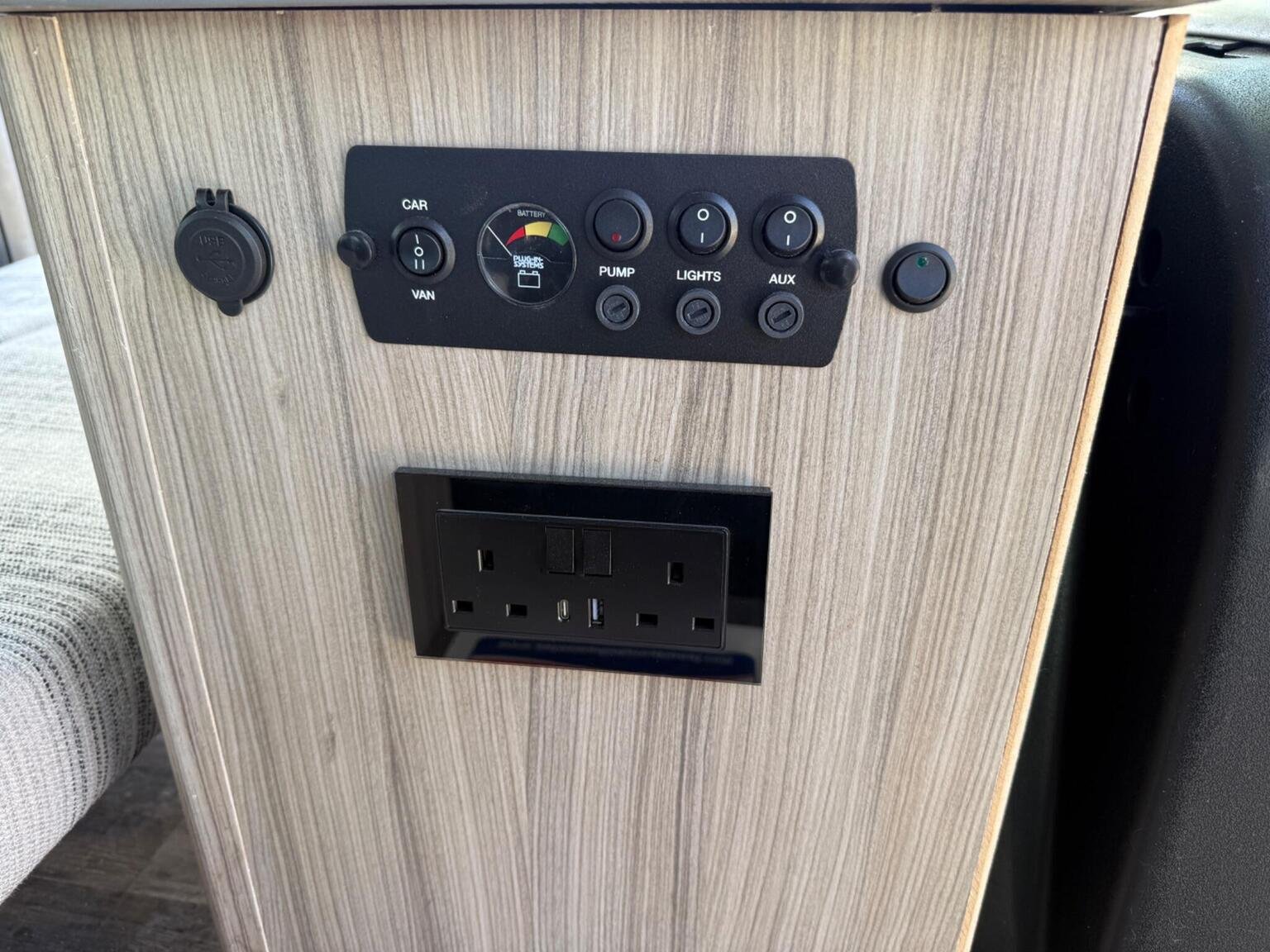 Twin gas hob, sink with cold water tap, 12v leisure battery system, 12v lighting, 12v sockets, 240v hook up, 240v sockets, side sofa pulls out into a compact double bed, 12v control panel, electric windows, remote central locking, CD player, Air Con (front cab)