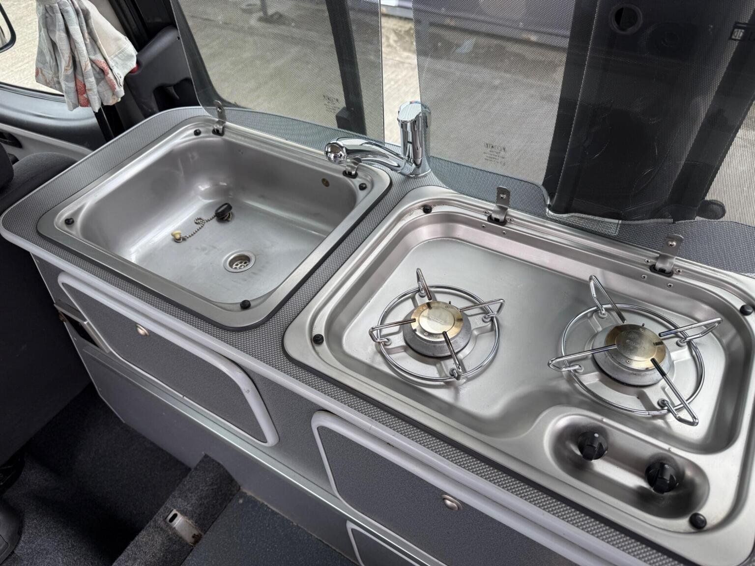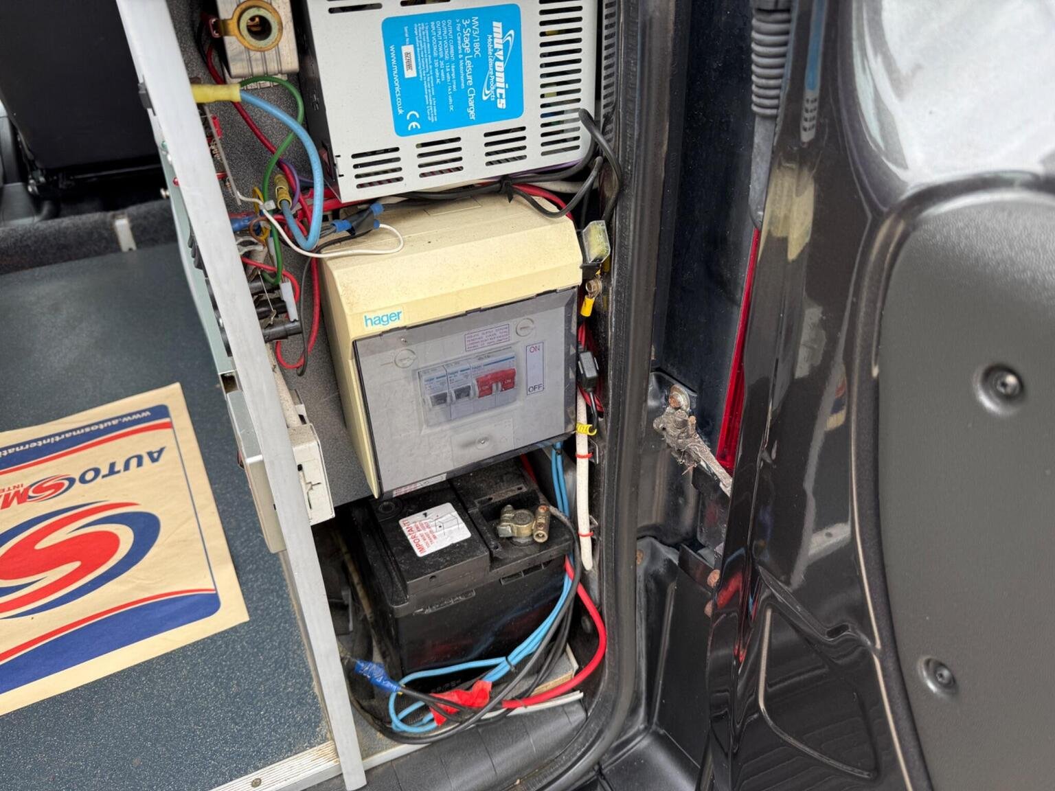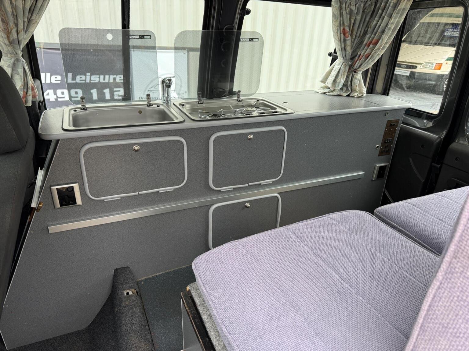 Custom-built professional conversion to micro-camper by Vantec (Cumbria); 12v caravan battery system; external 240 v plug-in with 2 power points. 12v lights, sink/hob/storage unit down one side; bench (storage below) down other side, converting to bed (6 ft x 38 inches; 1800 x 980 mm) – sleeps two cosily. Sink with water pump and tank, 2-burner hob with 2.75 kg gas tank, Central light; spot and strip lights over sink/hob unit.